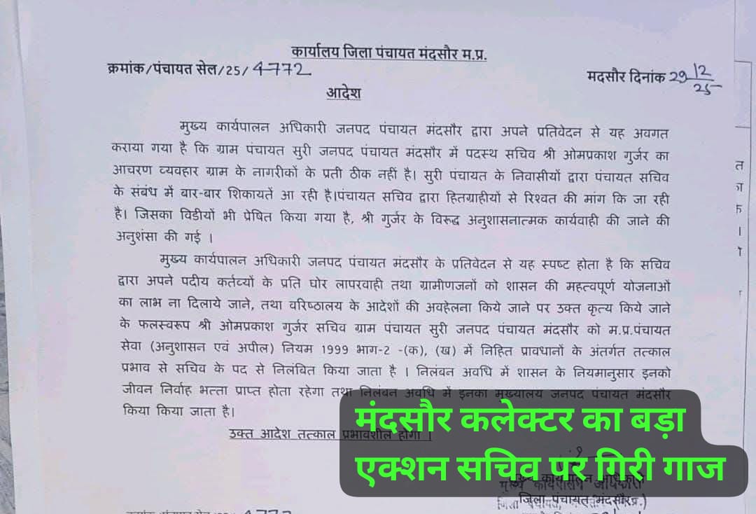 प्रधानमंत्री आवास योजना में पैसे मांगने पर सचिव सस्पेंड आदेश जारी आज का आर्टिकल में बात करेंगे मध्य प्रदेश के मंदसौर की मंदसौर से एक चौंकाने वाली खबर सामने आ रही है मंदसौर में सरकारी योजना का लाभ दिलाने वाले सचिव पर मंदसौर कलेक्टर ने बड़ा एक्शन लिया है रिश्वत मामले में सचिव को पद … Read more